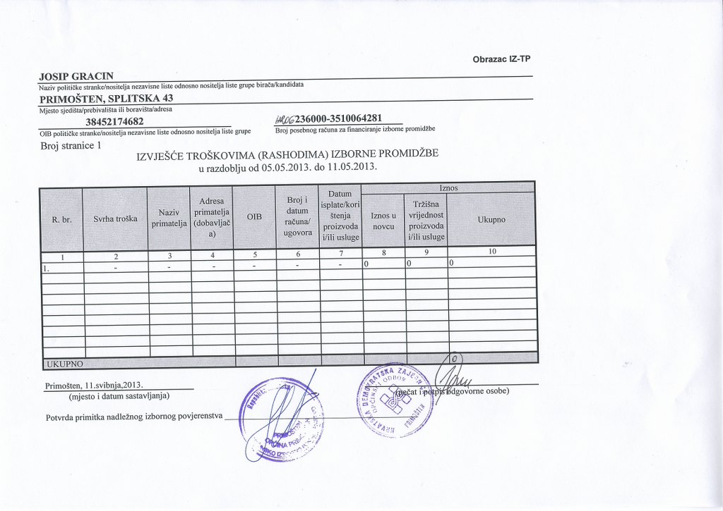 Financiranje izborne promidžbe - OO HDZ Primošten